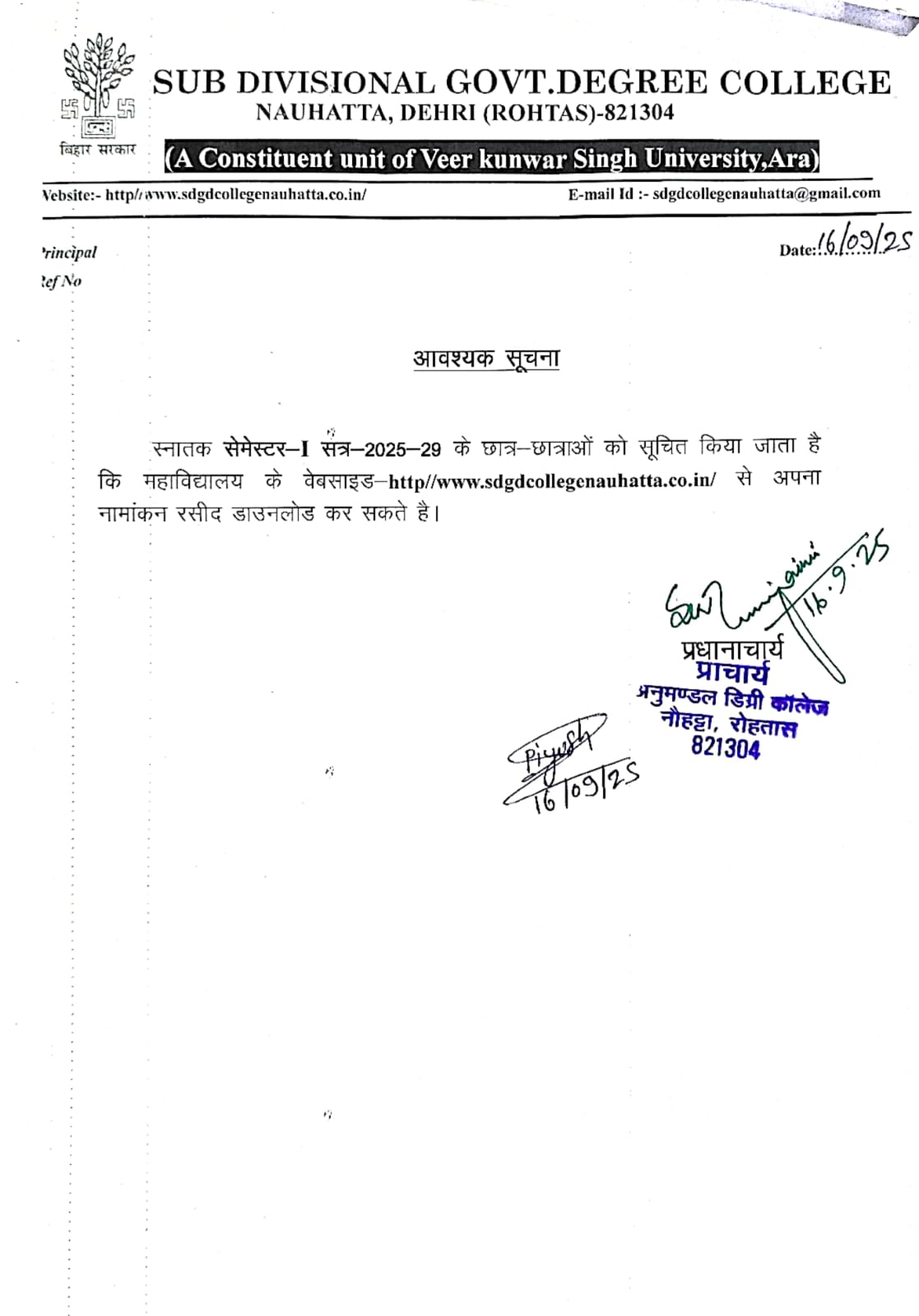 Sub Divisional Government Degree College, Nauhatta, Rohtas, is a constituent unit of Veer Kunwar Singh University, Ara is a prominent educational institution established in July 2019, spanning a sprawling 10-acre campus, under the leadership of Dr. Devi Prasad Tiwari, the contemporary Vice Chancellor of Veer Kunwar Singh University (VKSU), Ara.