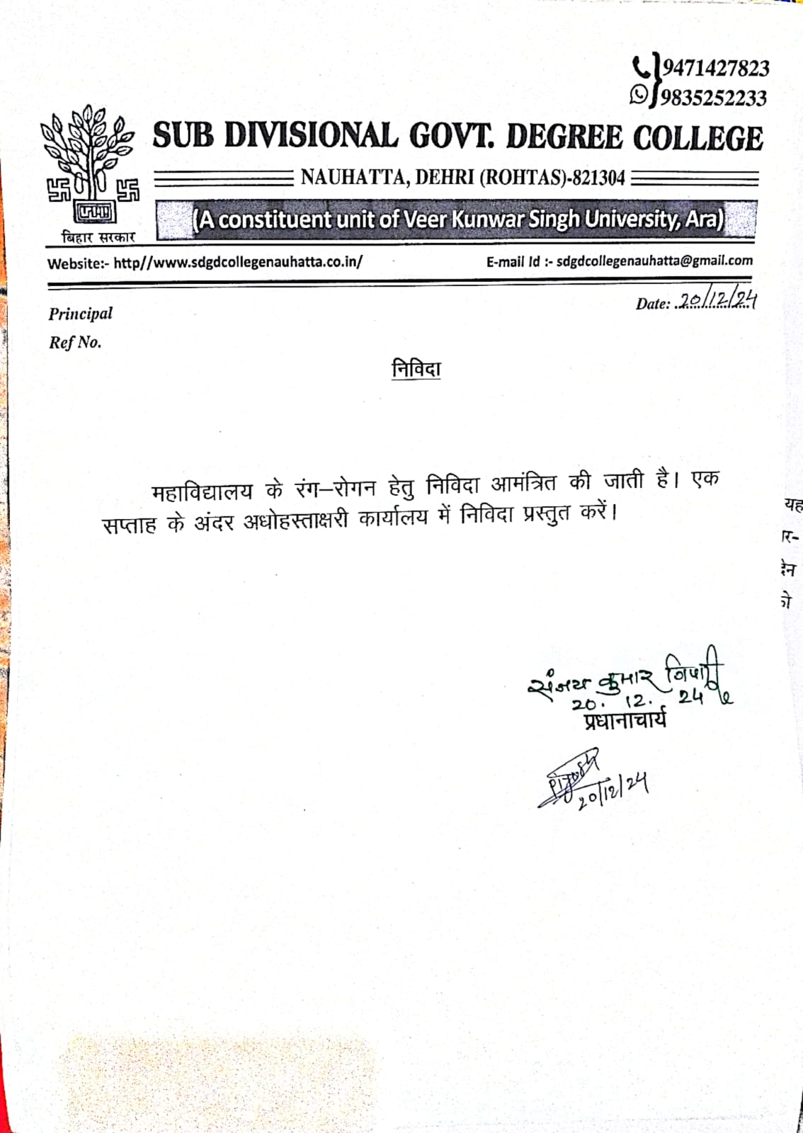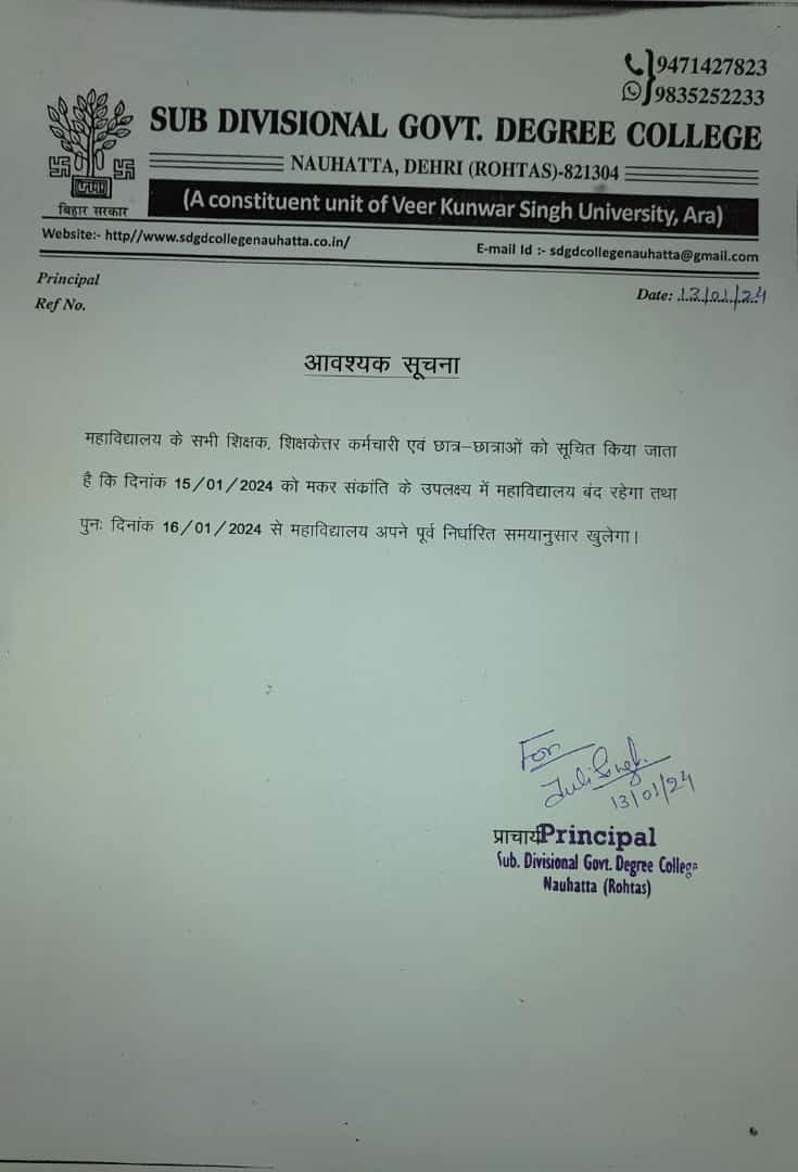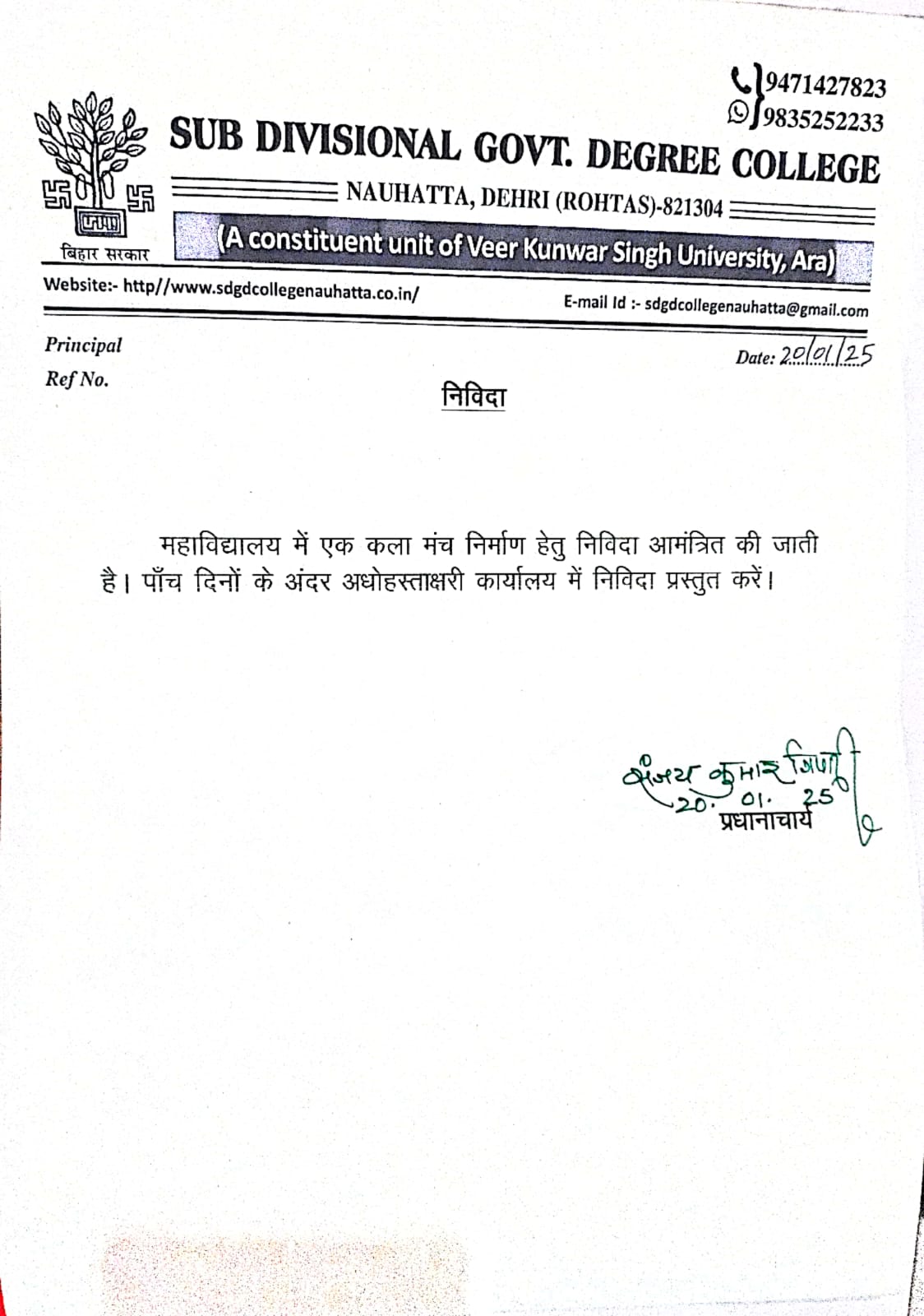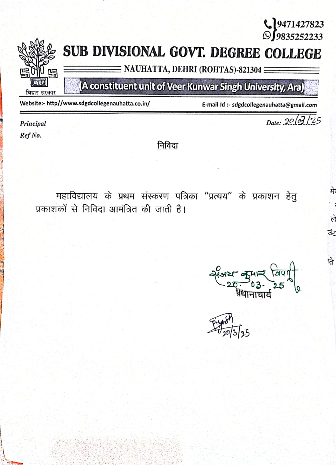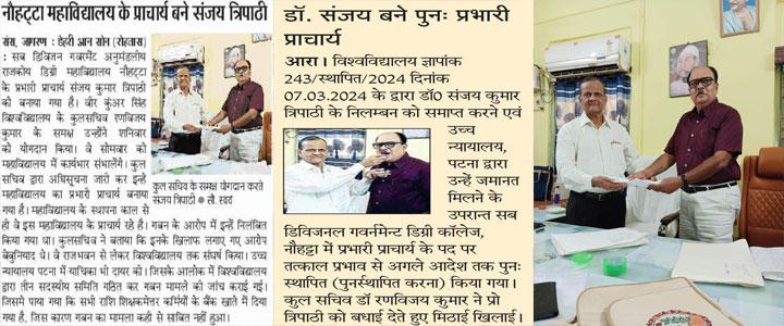 वीर कुँवर सिंह विश्वविद्यालय, आरा के माननीय कुलपति प्रो० देवी प्रसाद तिवारी जी, द्वारा अनुमण्डलीय डिग्री महाविद्यालय, नौहट्टा, रोहतास का प्रथम प्रधानाचार्य नियुक्त किये जाने से अपने को इस .....