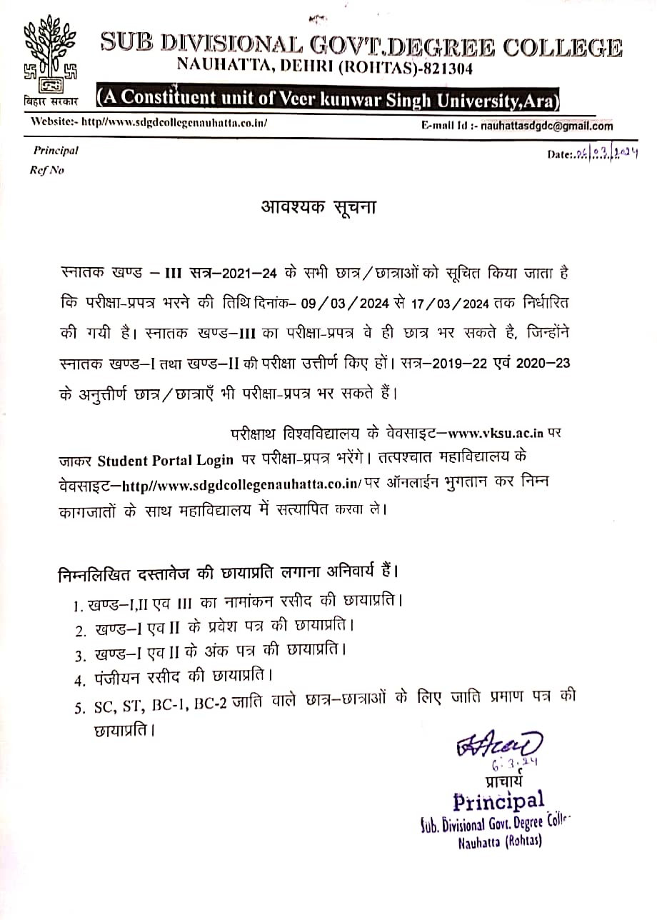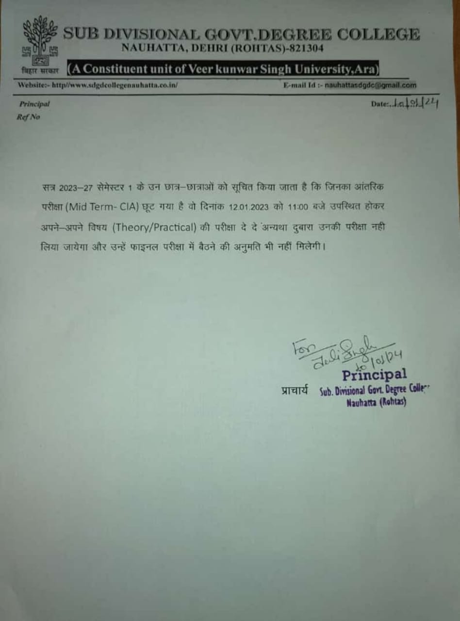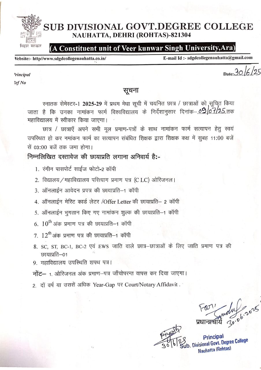 वीर कुँवर सिंह विश्वविद्यालय, आरा के माननीय कुलपति प्रो० देवी प्रसाद तिवारी जी, द्वारा अनुमण्डलीय डिग्री महाविद्यालय, नौहट्टा, रोहतास का प्रथम प्रधानाचार्य नियुक्त किये जाने से अपने को इस .....