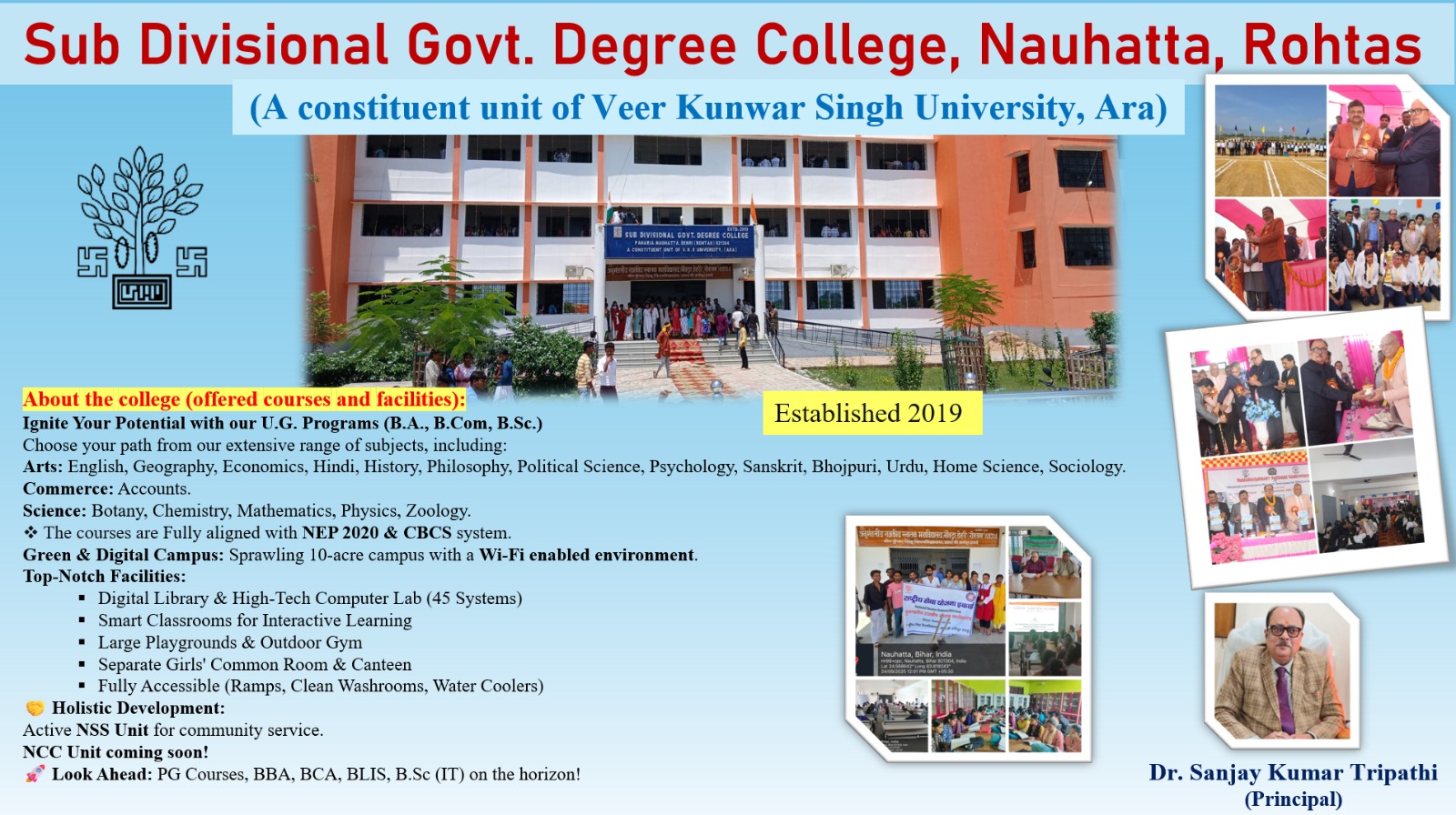 Sub Divisional Government Degree College, Nauhatta, Rohtas, is a constituent unit of Veer Kunwar Singh University, Ara is a prominent educational institution established in July 2019, spanning a sprawling 10-acre campus, under the leadership of Dr. Devi Prasad Tiwari, the contemporary Vice Chancellor of Veer Kunwar Singh University (VKSU), Ara.